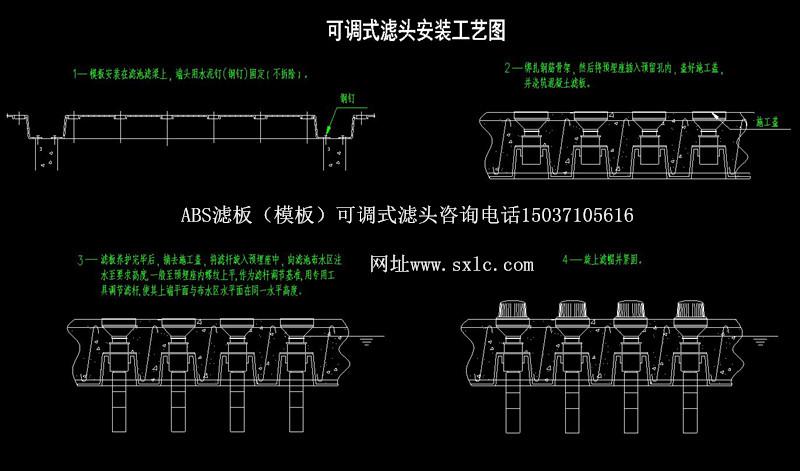 水廠濾池氣水反沖洗濾池常用的濾板有預(yù)制濾板和現(xiàn)澆整體濾板兩種:濾頭分為固定式和可調(diào)式兩種.固定式適應(yīng)于預(yù)制濾板:可調(diào)式長柄濾頭特別適應(yīng)于現(xiàn)澆濾板.也適應(yīng)于預(yù)制濾板.QSK-ll型可調(diào)式長柄濾頭原料采用高強度ABS顆粒樹脂(簡稱ABS工程塑料)經(jīng)高溫?zé)崛苡删苣ゾ叱尚汀?烧{(diào)式濾頭主要用:濾帽、濾桿、預(yù)埋座組成,濾桿上設(shè)有調(diào)節(jié)螺紋,可供上下調(diào)節(jié);且設(shè)有調(diào)節(jié)瓣與預(yù)埋座內(nèi)調(diào)節(jié)瓣防脫條結(jié)合,可控制濾桿調(diào)節(jié)精度,同時固定其位置。